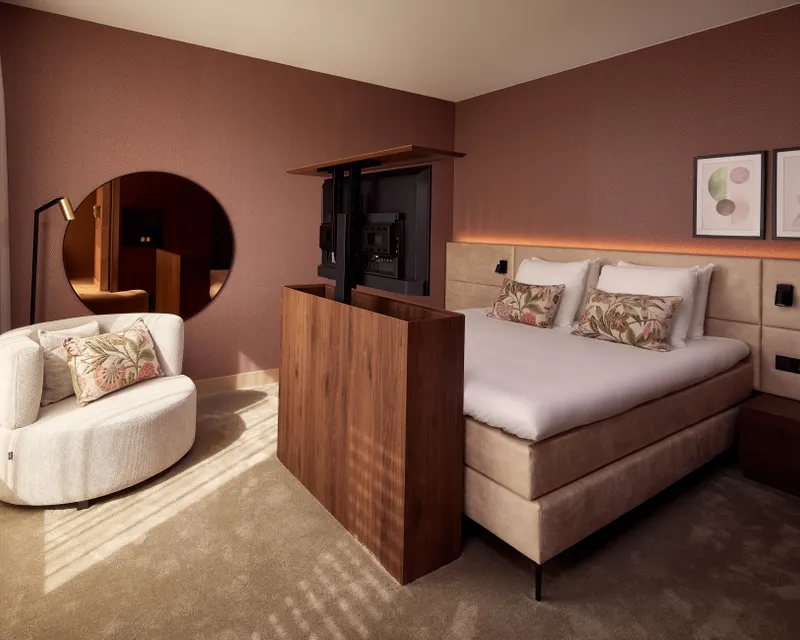 Brauchen Sie ein bisschen mehr Platz? Dann buchen Sie unser Deluxe-Zimmer mit offenem Bad und Regendusche. Darüber hinaus ist dieses moderne Zimmer mit einem schönen Kingsize-Bett, einem Smart-TV (mit Chromecast-Funktion), der aus dem TV-Schrank ragt, einer separaten Toilette, einer Minibar sowie Kaffee- und Teezubereitungsmöglichkeiten ausgestattet.