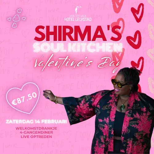 Op 14 februari 2026 keert Shirma Rouse voor de derde keer terug in Van der Valk Hotel Lelystad met Shirma’s Soulkitchen – Valentine’s Edition. Een avond vol soul, liefde en haar indrukwekkende stem, waarbij de mooiste love songs centraal staan. Perfect voor een bijzondere Valentijnsdate of een sfeervolle avond uit. Koop direct je tickets en verzeker jezelf van een plek bij deze speciale Valentine’s editie.